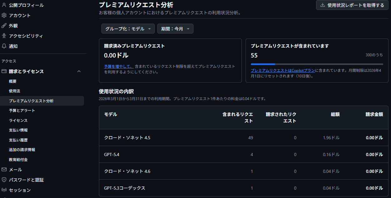 ところが、300カウントを超えました!と通知が出て使用できなくなったので、間違ってGPT-5系を使ってしまったのかと思ったのですが、GitHub Copilotのプレミアムリクエスト分析で見てみると使用したことがないClaude Sonnet4.6やGPT-5.4などがカウントされており、なんで?ってなってしまいました。