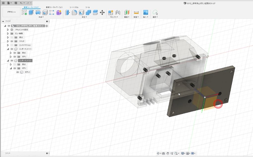 3D-CADでの設計画像ですが、一番幅をとっているのが非常停止ボタンですが、USBコネクタは取り付け向きに合わせて基盤長さ分だけ空間を占めるので内部がかなり複雑になってしまいました。